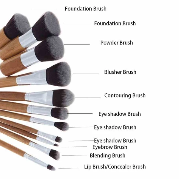Bamboo Professional Makeup Brushes Set, Pack of 11 Pieces. This pack includes, Eyeshadow Brush, Concealer Brush, Eyebrow Brush, Highlight Brush, Eye Smudge Brush, Blusher Brush, Foundation Brush, Powder Brush, Multifunction Blush Brush, Multifunction Foundation Brush, Mini Multipurpose Brush.