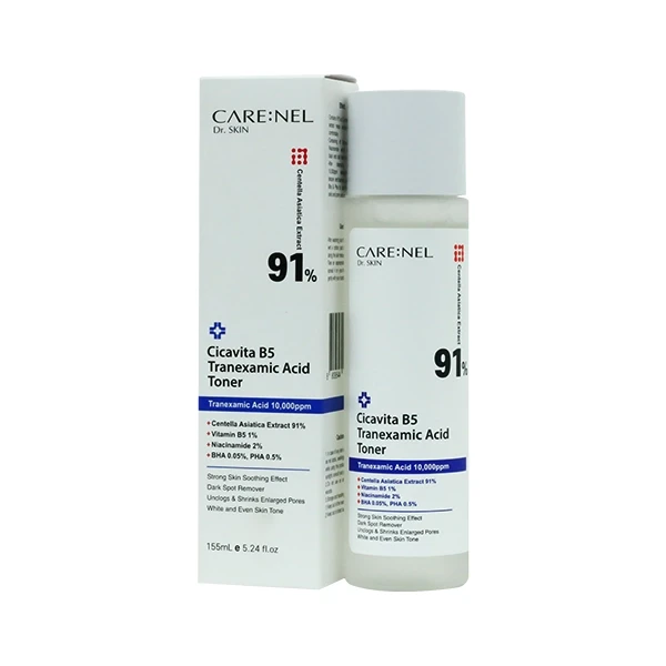Care-Nel Cicavita B5 Tranexamic Acid Toner is a brightening and soothing toner designed to help reduce the appearance of dark spots, hyperpigmentation, and uneven skin tone. Infused with Tranexamic Acid, Vitamin B5, and other nourishing ingredients, this toner works to hydrate and calm the skin while targeting discoloration. It is suitable for all skin types, especially for those dealing with pigmentation issues.