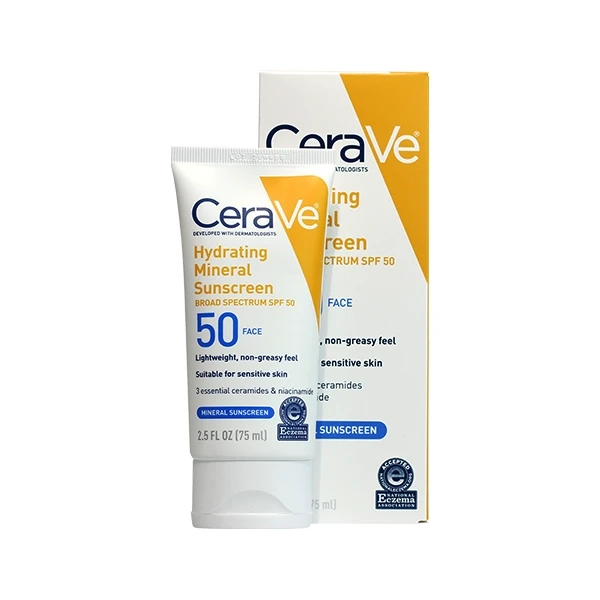 Protect your skin from the sun with a gentle, yet effective face lotion. CeraVe Hydrating Mineral Sunscreen Face Lotion with Broad Spectrum SPF 50 is a 100%-mineral, oil-free sunscreen with titanium dioxide and zinc oxide that forms a protective barrier on your skin’s surface to help reflect the sun’s UVA and UVB rays without irritating sensitive skin. Our formula has three essential ceramides to help restore the skin’s barrier and provide long-lasting hydration, as well as niacinamide to help calm your skin. It has been awarded the National Eczema Association Seal of Acceptance and the Skin Cancer Foundation Daily Use Seal of Approval.