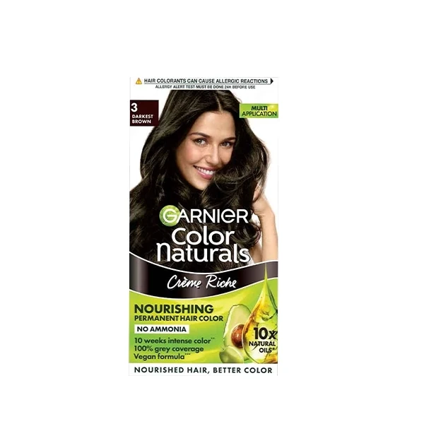 Transform your hair with Garnier Color Naturals Shade-3 Darkest Brown, a nourishing hair color enriched with natural oils for vibrant, long-lasting results. This ammonia-free formula provides 100% grey coverage and leaves your hair looking healthy, shiny, and naturally beautiful. Perfect for those who desire a rich, deep brown tone, Garnier Color Naturals is your go-to choice for salon-like results at home.