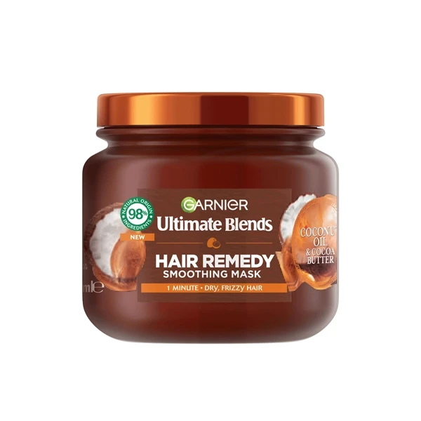 One scoop, one minute, one week of goodness! Steal a minute for yourself with Garnier Ultimate Blends Hair Remedy Masks. Our smoothing mask for dry frizzy hair has a 98% natural origin formula* blended with organic Coconut Oil and Cocoa Butter. Vegan formula