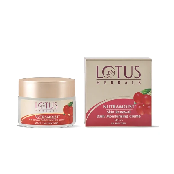 Enhances skin softness & gives a Glowing effect. Lotus Herbals NutraMoist Skin Renewal Daily Moisturising Creme is a luxurious, non-greasy moisturising cream with the benefits of SPF 25 for daily use. It has a unique blend of cherry and black plum extracts that provide long-lasting hydration while enhancing the capability of skin cells to retain moisture for a long time.