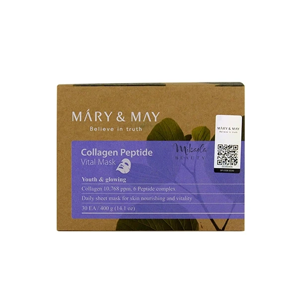 Mary&May peptide vital mask pack, containing low molecluar collagen and peptide which are effective for wrinkle and elasticity improvement, 30 sheets/400g