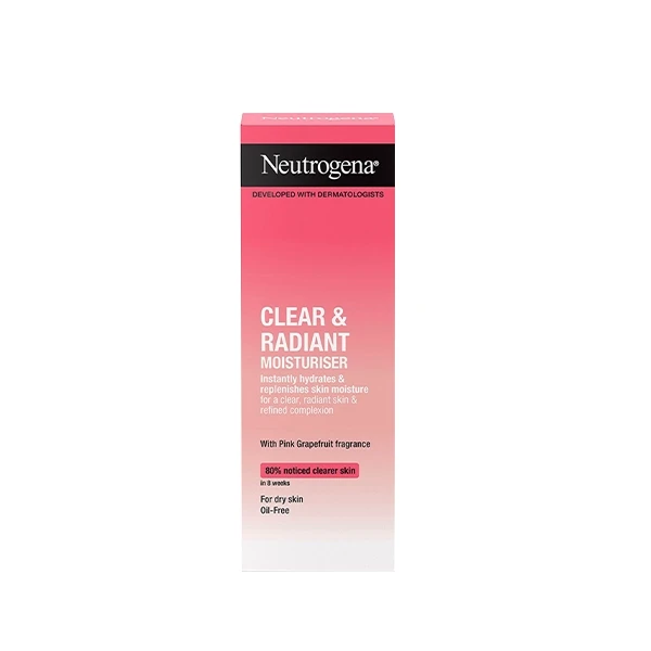 Formulated for skin with imperfections, Neutrogena® Clear & Radiant Oil-Free Moisturiser gives 24-hour hydration without clogging pores. Developed with dermatologists, the refreshing, light formula has a pink grapefruit fragrance and helps to keep skin clear and radiant.