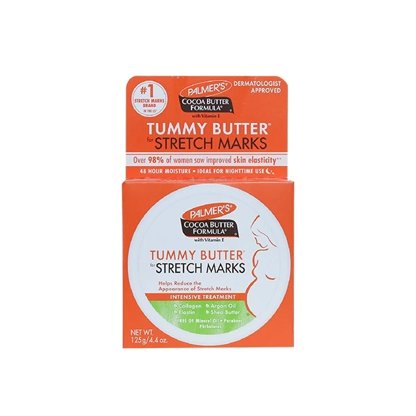 Palmer's Tummy Butter helps visibly improve skin elasticity and helps improve the appearance of stretch marks. Formulated with a blend of Cocoa Butter, Argan Oil, Shea Butter, Collagen & Elastin. Palmer’s Tummy Butter helps moisturise and nourish skin for 48 hours, allowing skin to stretch more comfortably. This gentle balm is ideal for use during and after pregnancy weight loss.