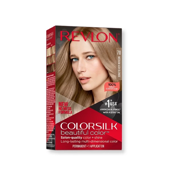 Transform your look with the elegant and sophisticated Revlon ColorSilk Beautiful Hair Color - 70 Medium Ash Blonde. This ammonia-free formula delivers a vibrant, long-lasting color that leaves your hair looking natural, healthy, and full of shine. Formulated with Revlon’s 3D Color Gel Technology™, this hair dye offers multidimensional color and a salon-quality finish from the comfort of your home. Whether you’re covering grays or enhancing your natural hair color, Revlon ColorSilk is the perfect choice.