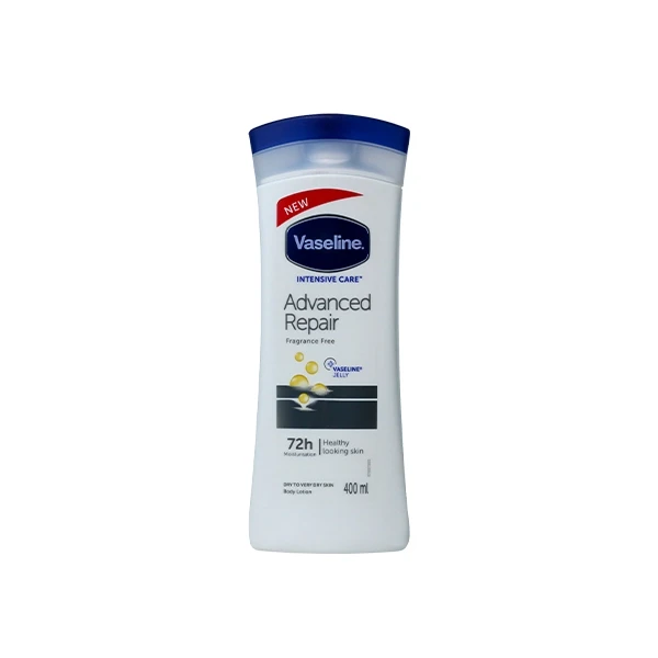 The new Vaseline® Intensive Care Advanced Repair Unscented Lotion moisturizes stubborn, dry skin, provides 48 hours of moisture, and helps you achieve soft, healthy-looking skin. Its dermatologist-tested, fast-absorbing formula is perfect for daily use.